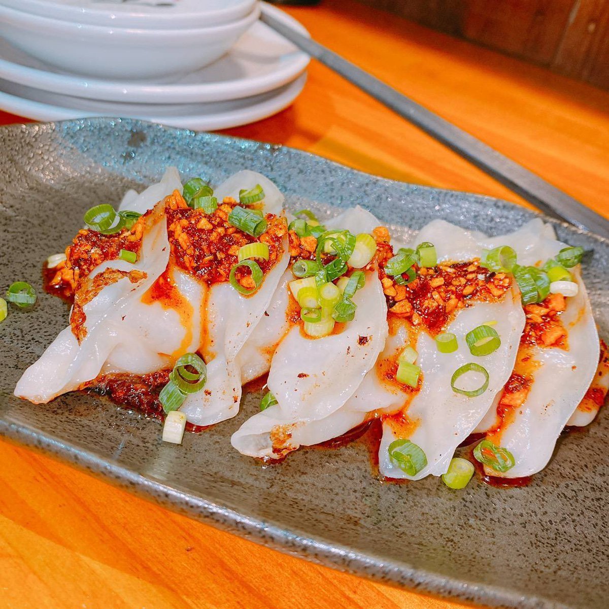 ピリ辛、旨辛な『食べるラー油餃子』お箸もお酒も進む。餃子です。