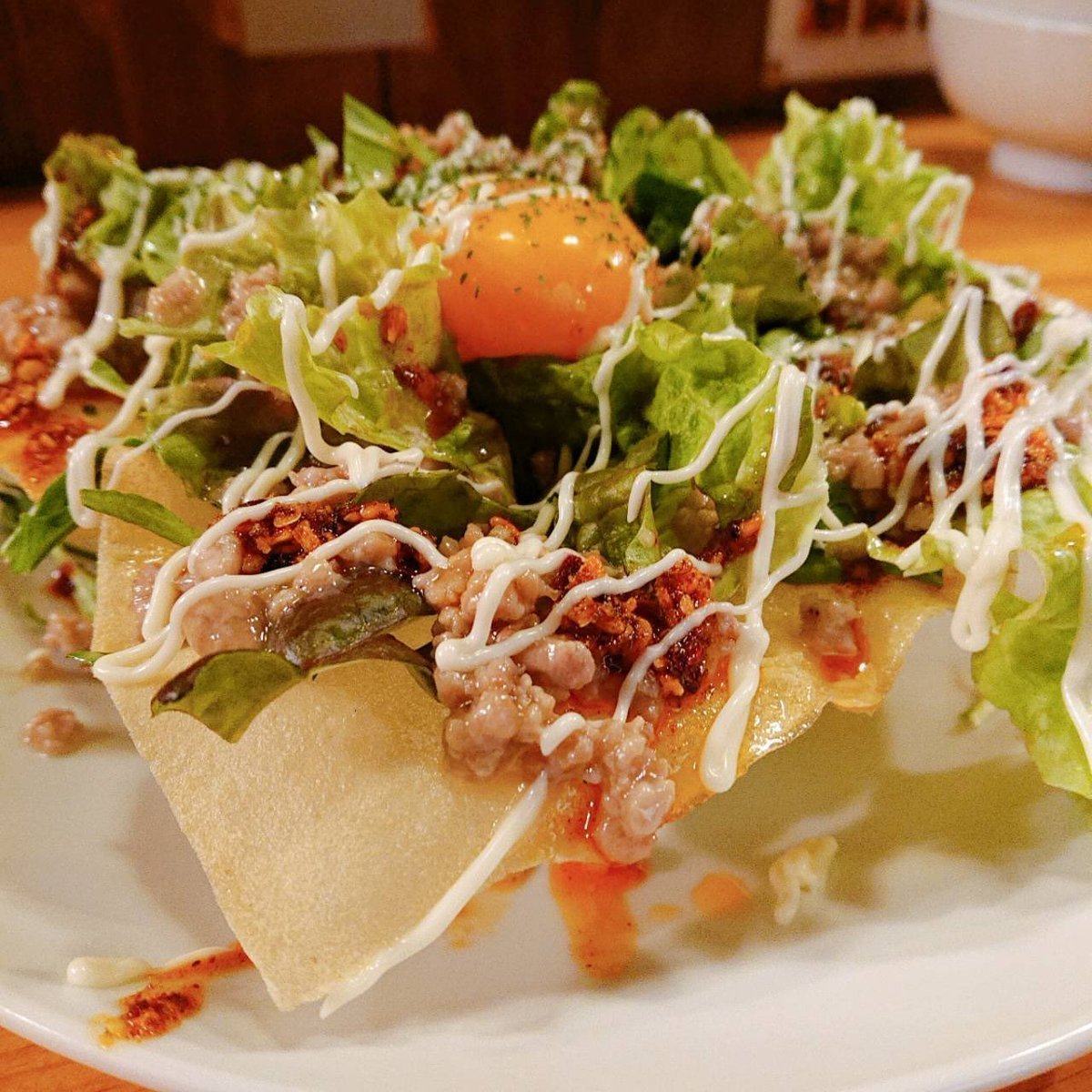 【 春巻きがお皿?白湯肉味噌サラダ】こんなサラダあった!!??春巻きの皮がお皿に!!味も旨し!!