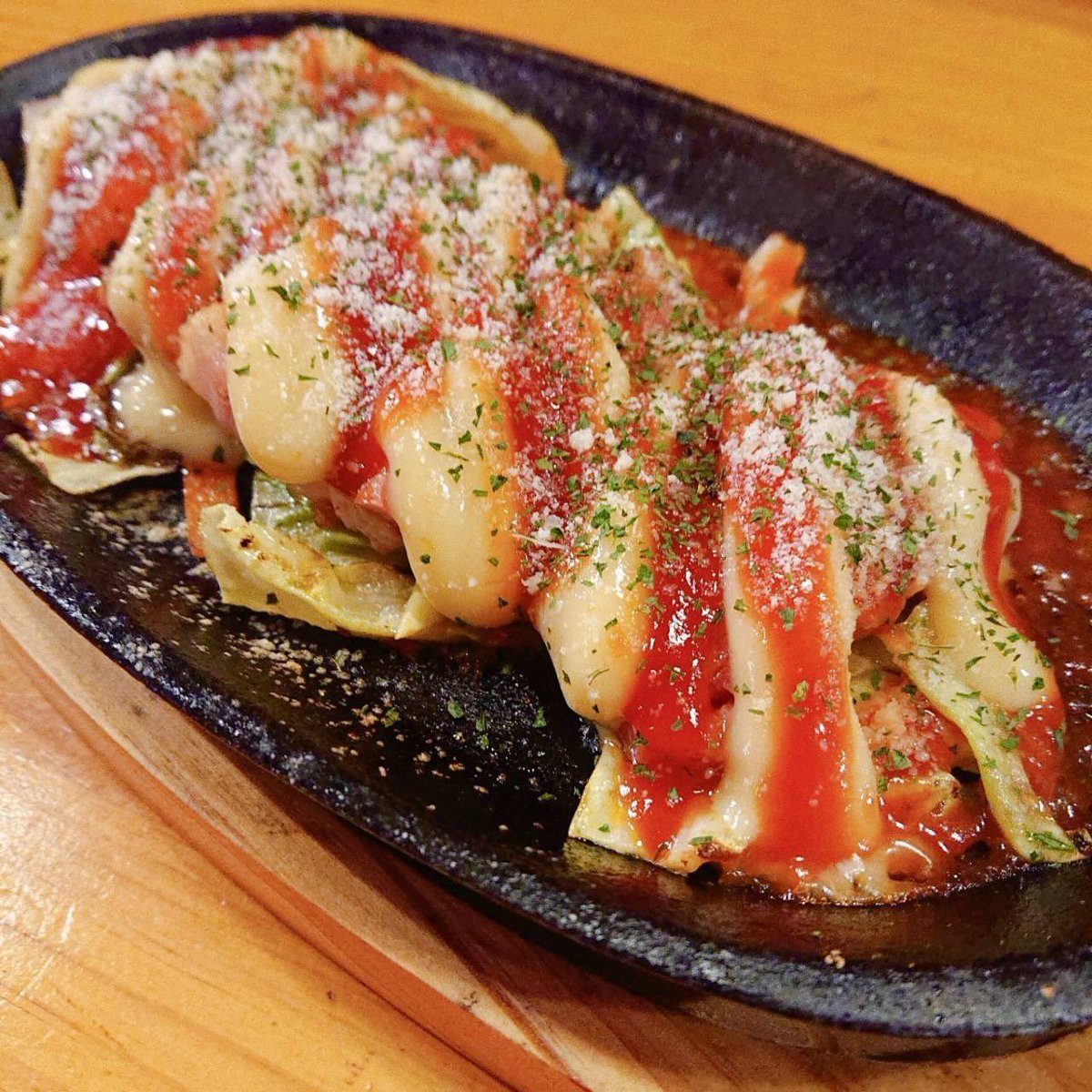 鉄板でアツアツ!!カリッと仕上がった。ベーコンにたっぷりのチーズソース!!文句無しに美味い!