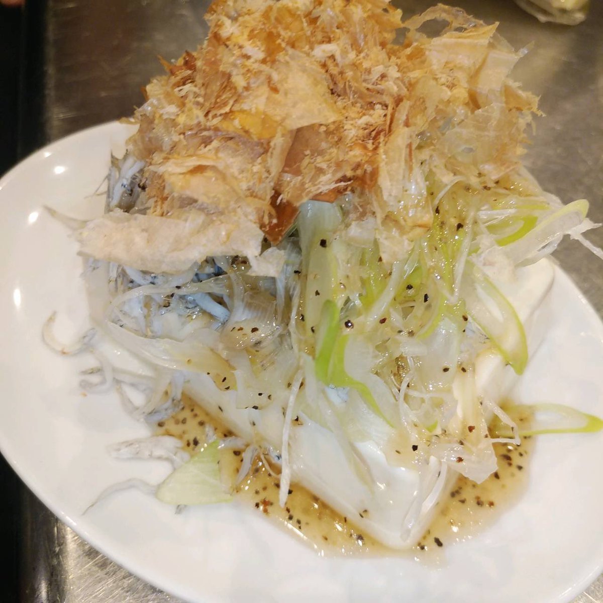 新メニュー試作中!!ネギも花かつおもどっさり!!ボリューム満点のどっさり【しらすやっこ】!