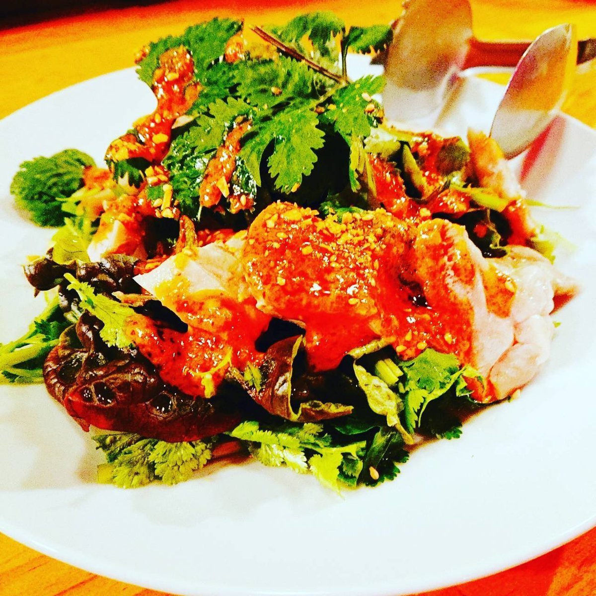 パクチーと蒸し鶏のやみつきサラダ!特性のゴマだれがこれまた相性抜群!!